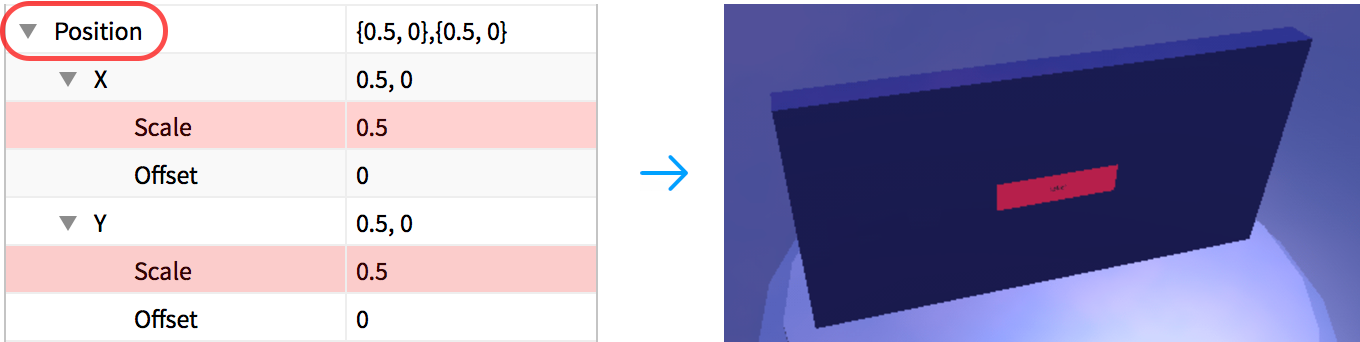 3. For Position, set both XScale and YScale to 0.5. This will center the label within the bounds of the surface GUI.