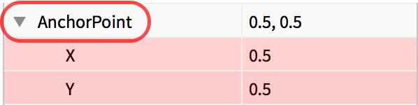 2. In the Properties window, find the AnchorPoint properties. Set both X and Y to 0.5 so that the anchor is centered.