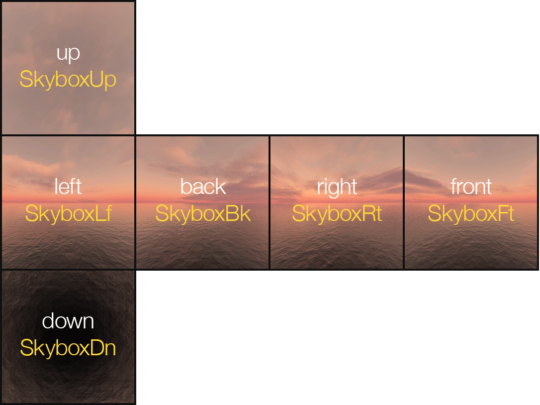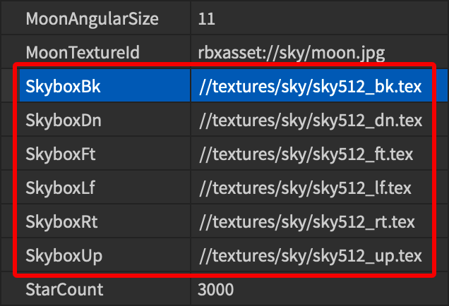 Sky/SkyboxBk|SkyboxBk,Sky/SkyboxDn|SkyboxDn, etc. The last two letters of these properties refer to which side of the skybox the specified image will be on.