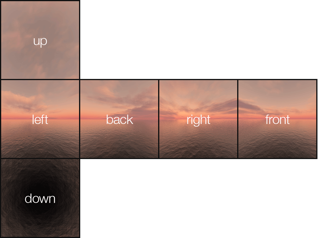 Skyboxes are made up of six individual images which are wrapped into a cube. A convincing skybox appears to be panoramic because the images are made to be perfectly aligned with each other — this lets you look in all directions without the impression of being inside a cube.