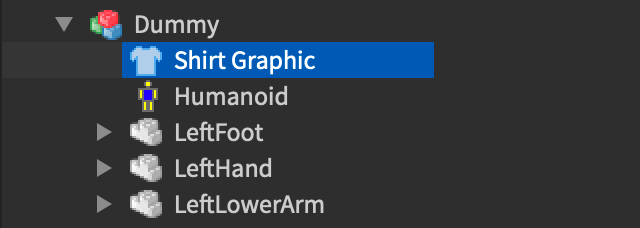 - Locate and select the new Shirt Graphic or Clothing object inside the dummy.
