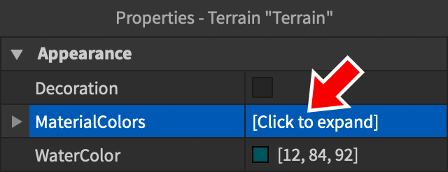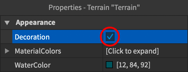 Terrain can be further customized by adjusting material colors or enabling decorations. These options are controlled through the Terrain object within Workspace.