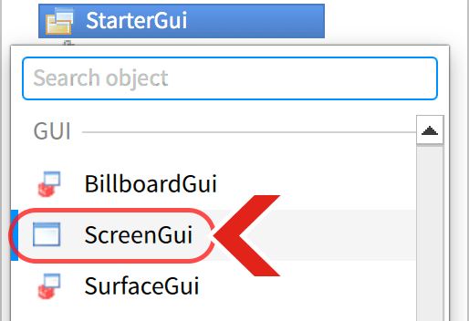 - Locate ScreenGui in the popup menu and select it. This will create a new 2D screen space in front of your 3D game world.