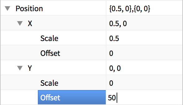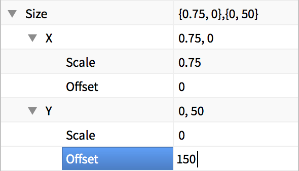 As you noticed above, Size also has a property called Offset. For sizing, Offset is useful if you want to create buttons, labels, or other objects which stay the same number of pixels (width or height) no matter what screen they’re being viewed on.