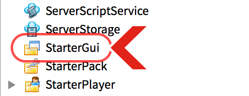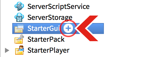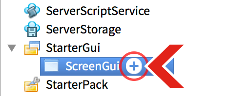 - In the Explorer window, hover over the new ScreenGui object, a child of StarterGui, and click on its circle ⊕ button.