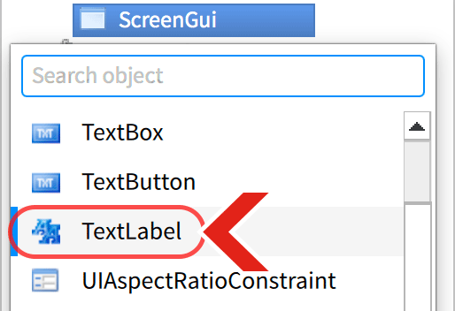 - Find TextLabel in the popup menu and select it. Note that an object can be found more easily by typing the first few letters of its name into the “Search object” input field.