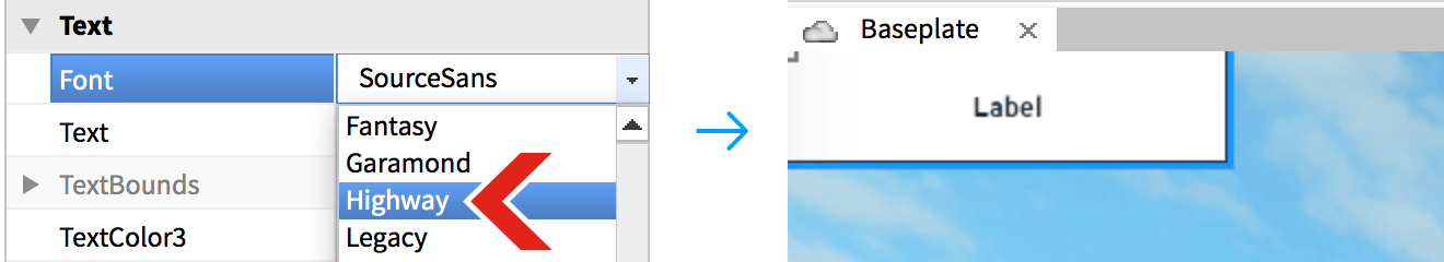 - For the Font property (within the Text section), click to the right of the font name and select Highway from the drop-down menu.