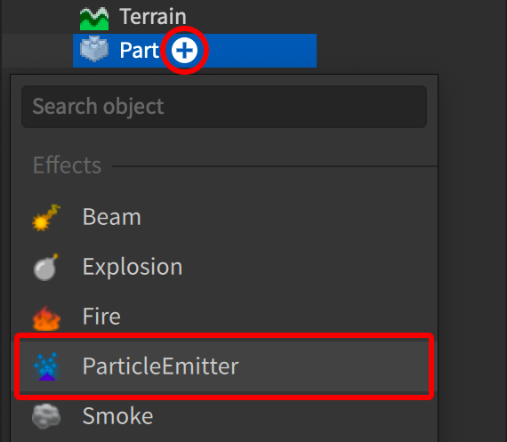 - Select the object in the Explorer window and insert a ParticleEmitter using the