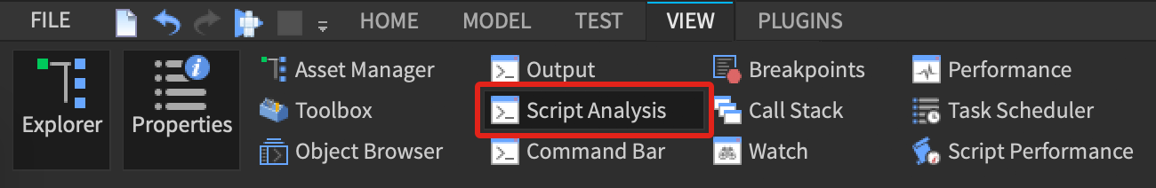 Roblox Studio contains a static script analyzer that validates code, flags all issues that will completely prevent the script from running, and warns you about issues that are likely to cause a bug. To display the script analysis panel, toggle Script Analysis from the View tab: