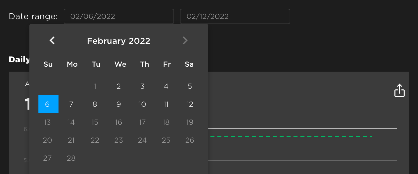 For each page, a date filter can be applied to all the charts on the page. This filter will be a date range where the user can select any specific time frame between the first date that data was available and present day. Below is an example of how the date filter looks. You must select start and end dates separately.