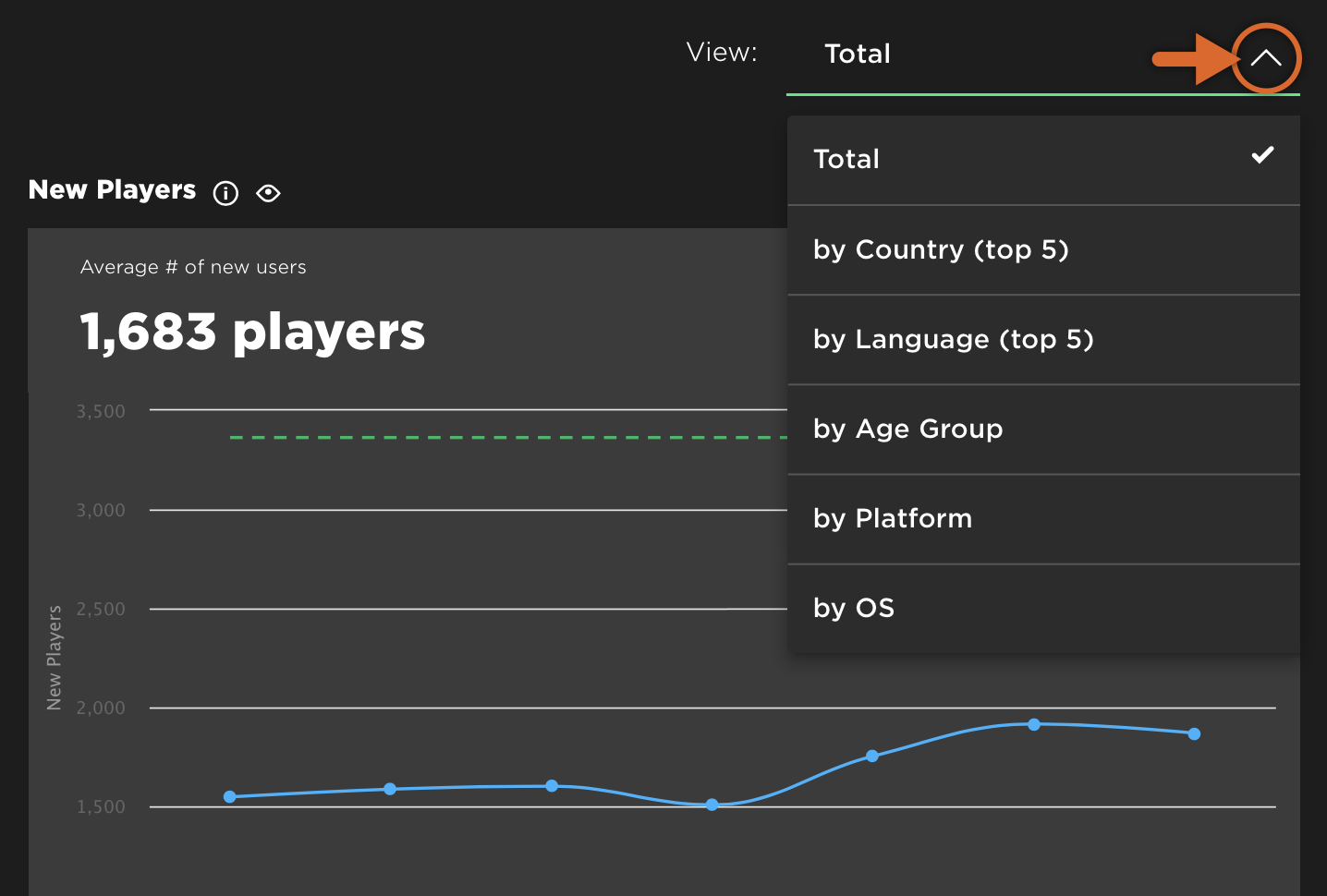 by Country (top 5) Selecting this option will break down a KPI chart by the top 5 countries (where your experience has the most DAUs) in addition to the Total (default view). "Other" is the aggregate of all other countries where you have users.