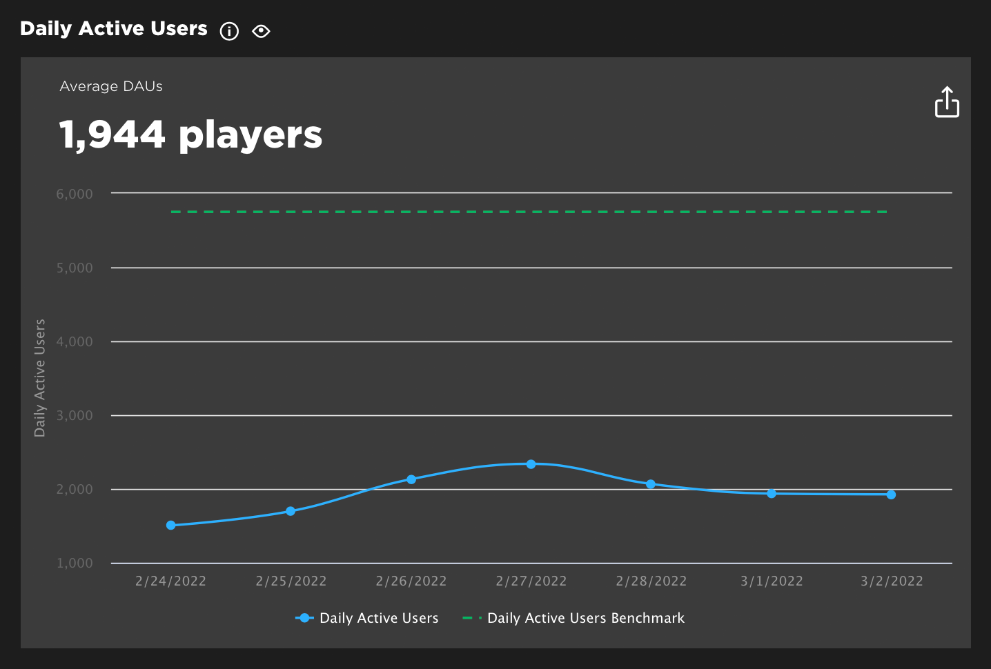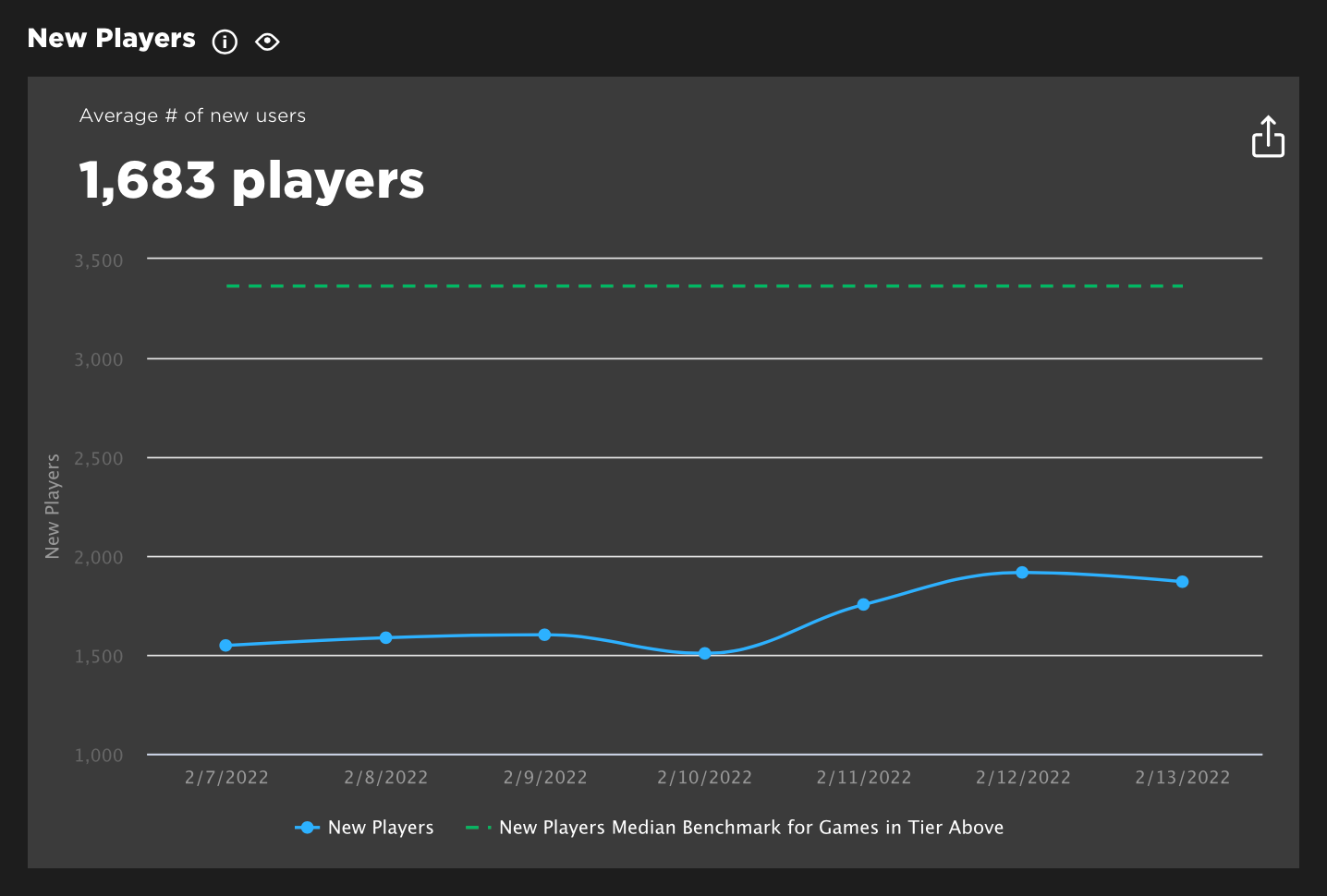 For the retention and stickiness KPIs, you will be able to see benchmarks which are updated on a 3-month quarterly basis. The experiences on the platform are divided into 6 tiers based on their overall engagement performance, including Top 250, 251-500, 501-1000, 1001-2000, 2001-4000, and 4001-8000. By the end of each quarter, ranks and tiers will be updated and the average value for each KPI during the quarter is calculated. Benchmark is then based on the median of all the experiences in each tier. Take D30 stickiness in the 501-1000 tier for example. The system will rank and decide the 500 experiences in this tier first, calculate the average D30 stickiness for each of these experiences in this quarter, rank the KPI among these experiences from lowest to highest, and take the median i.e. the value ranked at 250. Note that if your experience is in the top tier, you will see benchmarks for the Top 250 experiences. Every other experience will see benchmarks for the tier above. For example, if an experience is currently ranked 1600, then you will see benchmarks for the tier 501-1000. Also note that if your experience is ranked below 8000, you will see benchmarks for the tier 4001-8000 regardless of your individual experience rank.