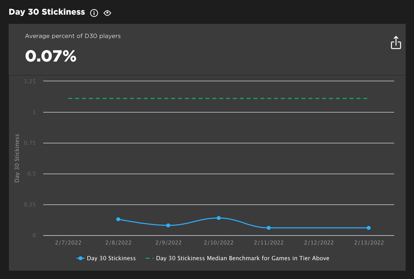 D30 Stickiness Percent of players (both new and existing) who play your experience everyday based on within 30 days.