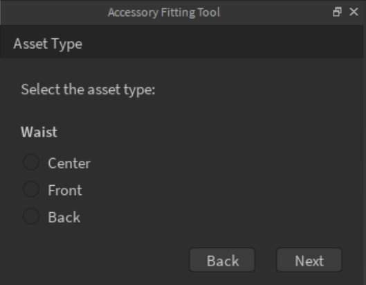 When choosing the Waist asset type, there are 3 possible attachment points available. A new dialog window will prompt you with the possible selections after clicking Next.