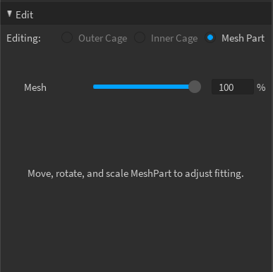 | Mesh Slider | Adjusts the opacity of the previewed accessory mesh to view the cage through the asset. |