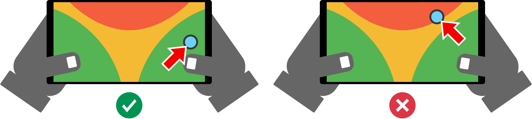Most mobile players use two thumbs — one on the virtual thumbstick/DPad and one on the jump button. Depending on the physical size of the device and the player’s hands, “reaching” too far from the bottom corners becomes uncomfortable or impossible, so you should avoid placing frequently-used buttons outside of the green zones.