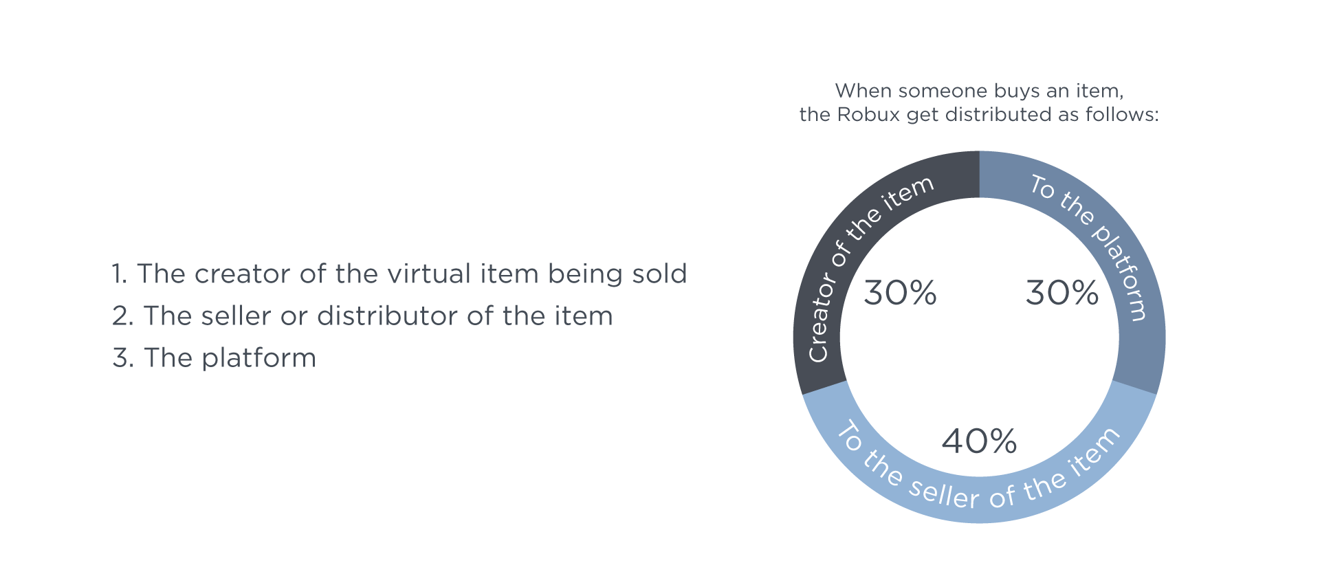 Oftentimes, the creator of the item is also the seller of the item. This is true when you built an experience and also created the items sold in your experience. For example, if you create and sell an “avatar flying ability” in your experience for 100 Robux, you earn 70 Robux for creating and selling the item and Roblox earns 30 Robux (platform share). Other times, you might create items that you sell in the Roblox marketplace. In this case, Roblox is both the seller and the platform and earns 70%, and you earn 30% as the creator.