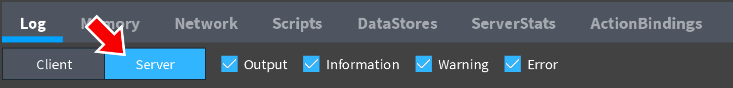 /articles/Developer Console|Developer Consoleby pressing F9 or typing/consoleinto the chat. - In the Log section, click the Server tab.
