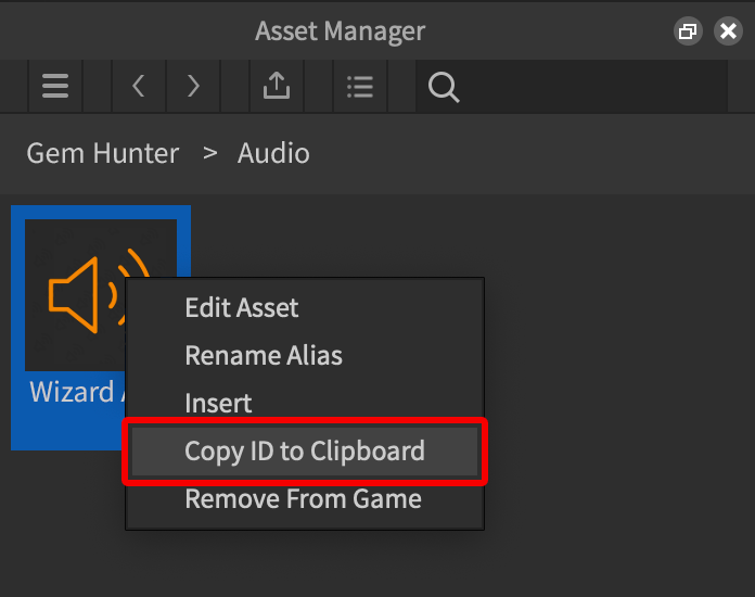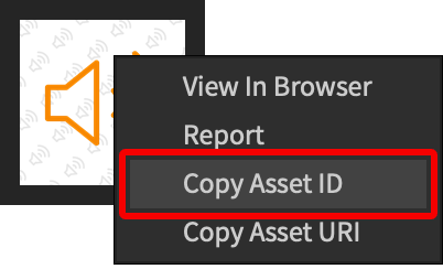 1. You can preview audio directly within Studio by clicking the play button in the corner of each listing. Once you locate an audio file to use, right-click the item and select Copy Asset ID (this ID will be required for playback testing below).
