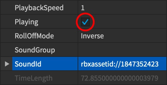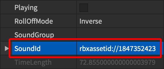 1. Select the new sound object and, in the Properties window, locate its SoundId property. Enter rbxassetid:// followed by a valid audio ID, for instance rbxassetid://1847352423.