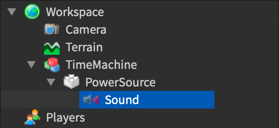 1. In the Explorer window, insert a new Sound object as a child of the source object.