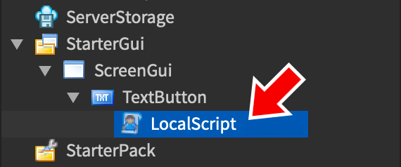 1. In StarterGui, add a new ScreenGui, then create a new TextButton within it. If you’re unfamiliar with buttons and their basic options, see articles/Creating GUI Buttons|Creating GUI Buttons.