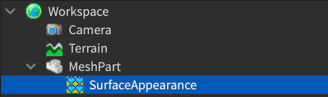 SurfaceAppearance objects let you override the appearance of a MeshPart with advanced graphics options. Most notably, SurfaceAppearance can apply a set of PBR textures to a mesh (PBR is short for Physically-Based Rendering and refers to a common texture format for defining extra physical details).