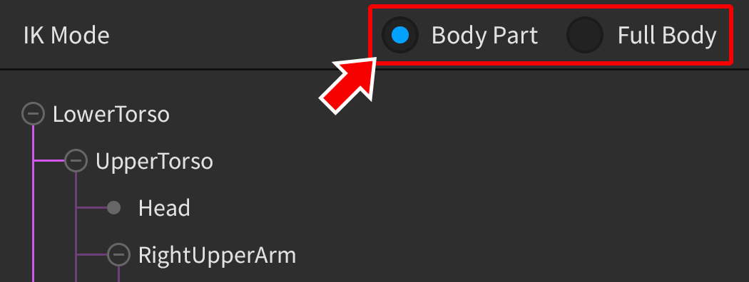 IK features both Body Part mode (exclusive to /articles/r6 vs r15 avatars|R15/Rthro rigs) and Full Body mode. This can be toggled from the IK window.