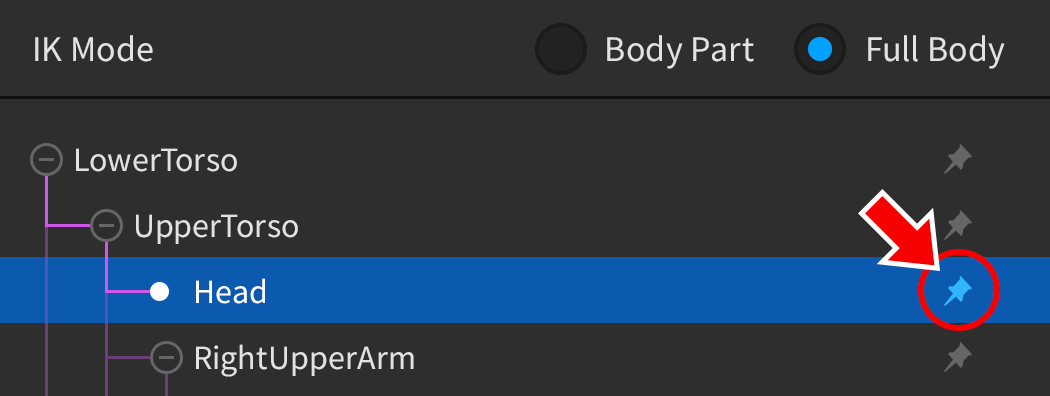 To pin a specific part, click the pin icon next to its name. Remember that Full Body mode must be enabled to use this feature.