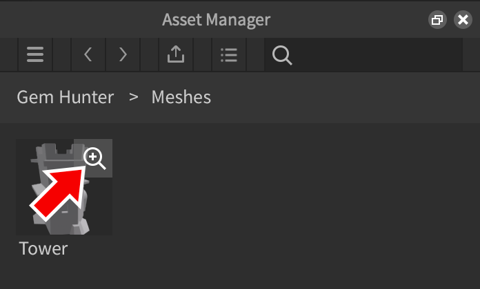 An image, mesh, audio file, or package can be closely inspected by hovering over its thumbnail and clicking the “magnify” icon.
