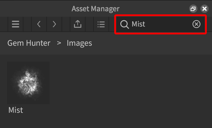 The top bar contains a filter tool that lets you filter assets in the current folder — just type in a filter query and the view will update to show matching assets.