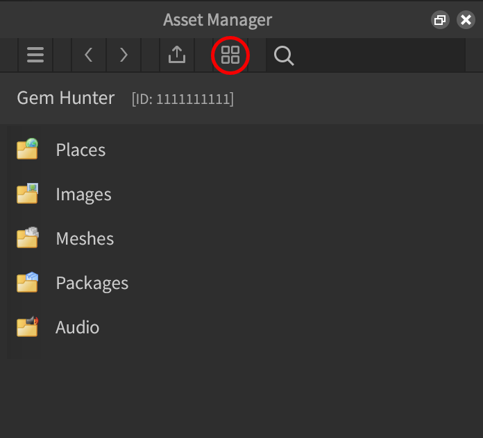 Assets are organized within folders based on their type. You can switch between grid view and list view by clicking the view toggle button: